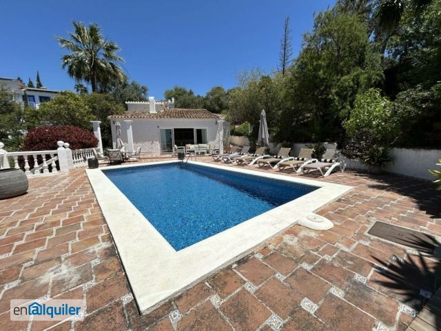 Esta villa independiente, totalmente amueblada y renovada, con piscina privada, se encuentra en la zona residencial de El Rosario (Marbella Este) y está disponible para alquilar por larga temporada. Se trata de una propiedad muy especial y poco habitual hoy en día, ya que ha sido renovada con mucho gusto conservando su estilo andalusí-morisco tradicional. La villa cuenta con un luminoso salón con techos altos y una cocina de concepto abierto con comedor situado a un nivel diferente, lo que permite disfrutar de las vistas hacia el salón y la zona de la piscina a través de grandes ventanales correderos de suelo a techo. Dispone de tres dormitorios distribuidos de forma que se garantiza la privacidad. El dormitorio principal incluye un baño en suite de diseño abierto y amplios armarios. Los otros dos dormitorios comparten un baño con ducha: uno de ellos es doble y el otro está amueblado con una cama individual y un escritorio, lo que lo hace ideal para tele-trabajar. La propiedad se ubica en una parcela elevada y se accede a ella a través de una rampa empinada que conduce al doble aparcamiento cubierto y a la entrada principal. La vivienda dispone de portones eléctricos y el terreno es de fácil mantenimiento, ya que la zona de la piscina está totalmente solada. Además, el precio del alquiler incluye un jardinero que se encarga del cuidado de la piscina y la parcela. La ubicación es muy práctica: a tan solo 800 metros hay un supermercado, farmacia, restaurantes y el Royal Tennis Club. El centro de Marbella está a solo 6 km, mientras que el campo de golf Santa Clara, Marbella Golf, la playa y el Hospital Costa del Sol se encuentran a menos de 2 km de distancia. El precio mensual de alquiler es de 4.500?, con los gastos de electricidad, agua, internet y alarma aparte, según consumo. No cobramos comisión al inquilino.