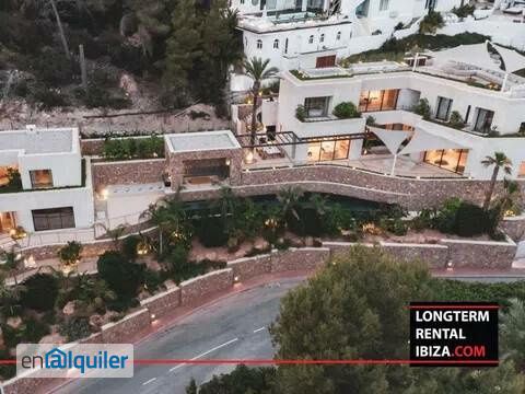 ANNUAL RENTAL - CAN FURNET. Spectacular Newly Built Villa with Guest House, Rooftop Pool and Panoramic Views Located in the exclusive gated community of Can Furnet, just minutes from Ibiza Town, this extraordinary villa offers the perfect fusion of security, privacy and cutting-edge design. Completed in 2023, the property has been constructed with the highest quality materials and finishes, and is fully licensed and certified. The property sits on a 1,428 m² plot with two independent entrances and 835 m² of built area distributed between the main house and a guest villa. Both structures are connected through beautifully designed outdoor spaces that invite relaxation and entertainment in equal measure. The main villa features a sophisticated layout with a spacious living and dining area, built-in sofas and elegant custom lighting. The modern open kitchen is complemented by a service area with laundry room and separate staff accommodation. There are three en suite guest bedrooms, a master suite with two dressing rooms, and a guest toilet. Large windows and seamless transitions between indoor and outdoor areas create a refined, airy ambiance throughout. The villa is crowned with a spectacular rooftop terrace featuring a small pool, chill-out lounge, bar area, and sweeping views of Dalt Vila and Formentera. The guest villa offers three additional en suite bedrooms, a fully equipped private gym, and a kitchenette, making it ideal for hosting visitors while maintaining privacy and comfort. The outdoor spaces are equally impressive, boasting a summer dining room with BBQ, a large swimming pool, solarium, Hammam, and multiple areas to unwind under the Ibiza sun. The villa also includes three outdoor parking spaces, smart home systems, and all the amenities needed for effortless year-round living in one of the island?s most prestigious enclaves. Schedule a viewing with our agent.
