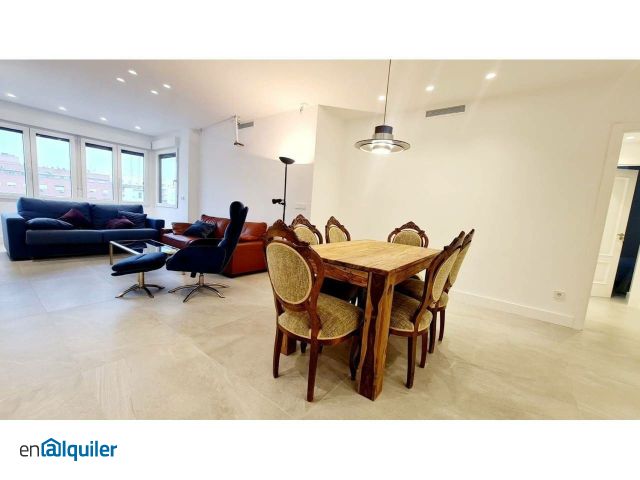 DOMUM REALTY Alquila: ¡Espectacular vivienda recién reformada con 4 dormitorios y 3 baños! *** DISPONIBLE A PARTIR DEL 16 DE JUNIO DE 2026 *** Para más información o para concertar su visita, no dude en contactar con nosotros, llamando o enviando un mensaje al (+34) 6-4-0-7-9-8-8-6-3 *** La vivienda está completamente reformada incluyendo todas las instalaciones de fontanería y electricidad, tiene dos entradas, una de servicio que da a la cocina, y otra principal que da al salón. Todas las instalaciones son nuevas, electricidad, fontanería, así como el suelo porcelánico de toda la casa. Tiene paredes lisas pintadas en color blanco, todas las puertas (incluidas las de los armarios) están lacadas en blanco, y todas las ventanas son climalit de doble acristalamiento con aislamiento térmico y acústico. Todos los dormitorios, el salón y la cocina tienen aire acondicionado (frio/calor) recién instalado, y todas las dependencias son exteriores, además cuenta con calefacción central incluida en el alquiler. Al entrar por la puerta principal, a la izquierda hay un armario empotrado de dos puertas. A la derecha y de frente se accede al salón-comedor que es muy luminoso, y está amueblado con dos confortables sofás, uno de dos plazas y otro de tres, una cómoda butaca de terciopelo con reposapiés, mesa de comedor para seis comensales (es extensible, hasta 10), Smart TV de 55", pantalla de proyección, y cuenta con grandes ventanales. Como todas las dependencias, hay radiador y aire acondicionado (independiente), y una muy completa iluminación, incluyendo una preciosa lámpara de diseño sobre la mesa. Pasando a la zona de dormitorios, nos encontramos con un distribuidor con un armario empotrado, que da paso al dormitorio principal, a otros dos grandes dormitorios, y un baño. El dormitorio principal dispone de cama de matrimonio de 150 cm, televisor Smart TV de 44", escritorio, y cinco armarios empotrados vestidos. Cuenta con un gran baño en suite con bañera de hidromasaje y candilejas, separada por una puerta corredera, del bidet, inodoro, lavabo con armario inferior, y espejo retroiluminado. El segundo dormitorio dispone de un armario empotrado vestido de dos puertas, una cama doble de 135 cm con canapé, y escritorio. El tercer dormitorio también tiene una cama de 135 cm con canapé, dos armarios empotrados vestidos de dos puertas, y escritorio. El segundo baño cuenta con una amplia ducha con mampara, además de inodoro y lavabo con espejo con marco de retroiluminación LED. Desde el salón se accede también a un pasillo donde se encuentra a la derecha un baño con ducha y mampara, lavabo con armario inferior e inodoro, a continuación hay un trastero, y a mano izquierda una cuarta habitación, que puede ser usada como dormitorio, zona de estudios o despacho. El pasillo acaba en una magnifica cocina independiente, completamente equipada con todos los electrodomésticos, lavavajillas y lavadora panelados, horno, microondas, un gran frigorífico americano, vitrocerámica, campana extractora, mesa para cuatro comensales, menaje completo, además de una gran cantidad de armarios. La urbanización dispone de portero físico, piscina, amplias zonas ajardinadas y vigilancia 24 horas. La vivienda cuenta además con una plaza de garaje en la misma finca, que se alquila aparte. Su ubicación es inmejorable ya que está a escasos metros de la emblemática Calle de Alcalá, muy cerca de la Plaza de Toros de las Ventas, y muy bien comunicada con el transporte público entre las paradas de metro de Manuel Becerra (Líneas 2 y 6) y Ventas (Líneas 2 y 5), además de numerosas líneas de autobuses. La urbanización se halla en una zona muy tranquila, pero un par de calles más allá encontrarás todo tipo de comercios, varios supermercados, mercados, tiendas, bancos, farmacias, y una infinidad de bares y restaurantes.