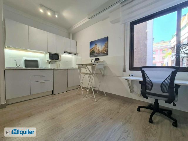 Luxury studio: Home cinema and TV with 3m screen, Wifi-fiber, hot and cold air conditioning, furnished and equipped. Exterior on a pedestrian street without noise. Luxury building next to Gran Vía and Plaza de España with doorman 16 hours/day x 365 and 4 elevators. The monthly fee changes depending on the minimum stay: - 4 months is 1625 eur - 5 months is 1575 eur - 6 and 7 months are 1550 eur - 8 months is 1475 eur - 9 months is 1425 eur - 12 months are 1325 eur Parquet, kitchenette, refrigerator with independent freezer, microwave, A++ washing machine, designer furniture, tall cabinets with 4 doors, cleaning closet, 135x190 folding bed with slatted base and memory foam mattress, desk special height for a computer. Clothes line for drying. TRUSTED NEIGHBORHOOD. Next to the Plaza de España metro (with direct access by elevator), extraordinary communication with public transport, and several parking less than 2 minutes away. 50m from Gran Vía and its commercial and leisure offer. Just a few minutes walk from green areas. Payroll. Non-smoking. No pets. Kitchenware, dishes, cutlery, bedclothes, and towels. Ready to move in!