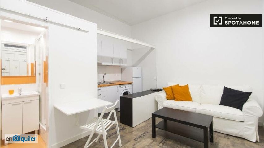 Este encantador estudio está disponible para alquiler en Trafalgar, Madrid. El apartamento tiene un sofá que funciona como una cama doble, así como una pequeña mesa y sillas y un televisor. La cocina tiene una lavadora y una cocina eléctrica, mientras que el baño tiene un inodoro, lavabo y ducha. El apartamento está cerca de varios bares, restaurantes y una discoteca. Hay un supermercado donde puedes hacer tus compras, y también hay un centro de gimnasia cerca.