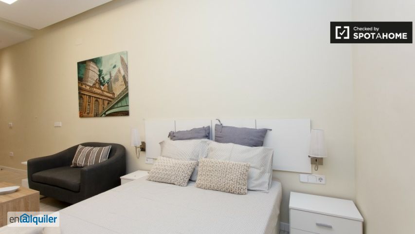 Este estudio apartamento está muy bien equipado y moderno, con características agradables y muebles, y está disponible para alquiler en la zona de Almagro. La cocina está bien equipada para un estudio, con una cocina eléctrica y microondas, espacio en el armario, e incluso un lavavajillas. Hay una cama doble y un televisor de pantalla plana enorme, así como un escritorio y un pequeño sofá. El baño es muy moderno y tiene una amplia ducha. La zona es muy cosmopolita, y encontrará un montón de tiendas, bares, cafeterías y restaurantes cerca. El muy popular y agradable Plaza de Olavide es de unos pocos minutos a pie, que es el lugar perfecto para pasar una noche en una terraza con unos amigos.