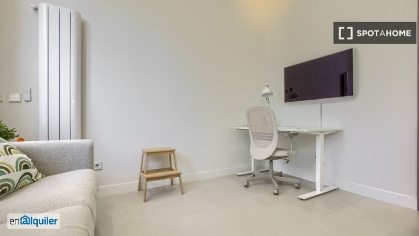 Este cómodo y equipado estudio está disponible para alquilar en Marroquina. El apartamento está amueblado y cuenta con aire acondicionado individual, calefacción central y sistema de agua caliente eléctrica. Incluye cocina equipada con lavavajillas, horno y secadora. Dispone de lavandería privada. Ofrece entretenimiento e internet (wifi incluido). No se permite fumar ni se admiten mascotas. Spotahome ha revisado personalmente esta propiedad, garantizando su calidad y seguridad, y todos los propietarios de Spotahome son investigados exhaustivamente. Marroquina es un barrio agradable y bien comunicado en el municipio de Madrid, que ofrece servicios básicos y un cómodo acceso a los servicios esenciales. En las inmediaciones, encontrará una variedad de opciones gastronómicas como Bar el Parque 2 y Reformas Lavín, así como supermercados como Supermercados la Despensa y Condis. Esta ubicación le ofrece todo lo necesario para una vida cómoda.