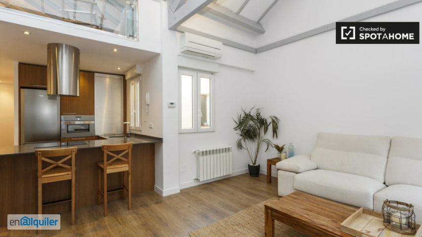 Un elegante apartamento luminoso estudio se encuentra disponible para alquiler en el barrio de Prosperidad de Madrid. Esta propiedad podría ser descrito como 'de lujo', ya que tiene aire acondicionado, un balcón, un entresuelo, y mide un total de 78 m². La cómoda sala de estar es en la planta baja, y se puede subir las escaleras para llegar a la habitación con encanto. La elegante cocina está completamente equipado - también tiene un lavavajillas, una lavadora y una secadora. Este apartamento se encuentra en la calle de Ramos Carrión en el barrio de Prosperidad de Madrid. La zona es muy animada y tiene tiendas, cafés y restaurantes para satisfacer todas sus necesidades. Estación de metro Alfonso xiii es de 3 minutos de distancia y hay varias paradas de autobús cerca.