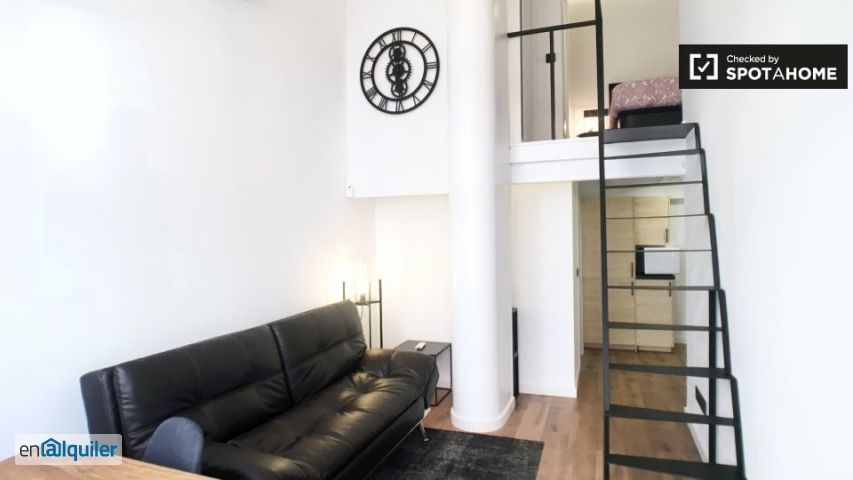 Este apartamento de 37 m² y 1 dormitorio está disponible para alquilar en Tetuán, Madrid, justo al lado del Paseo la Castellana. Hay un sofá frente a un televisor de pantalla plana en la planta baja, así como una mesa de comedor y sillas. La zona de cocina está totalmente equipada con cubertería y vajilla y también tiene una pequeña cocina eléctrica y microondas. También hay un baño en la planta baja que tiene un inodoro, lavabo y ducha, mientras que un baño en el entresuelo tiene un inodoro y un lavabo. El nivel del entrepiso también tiene el dormitorio, que tiene una cama doble, calefacción y a c, un armario empotrado y una cómoda. El apartamento tiene varios cafés, restaurantes y una farmacia cerca. También hay un gran parque cerca,